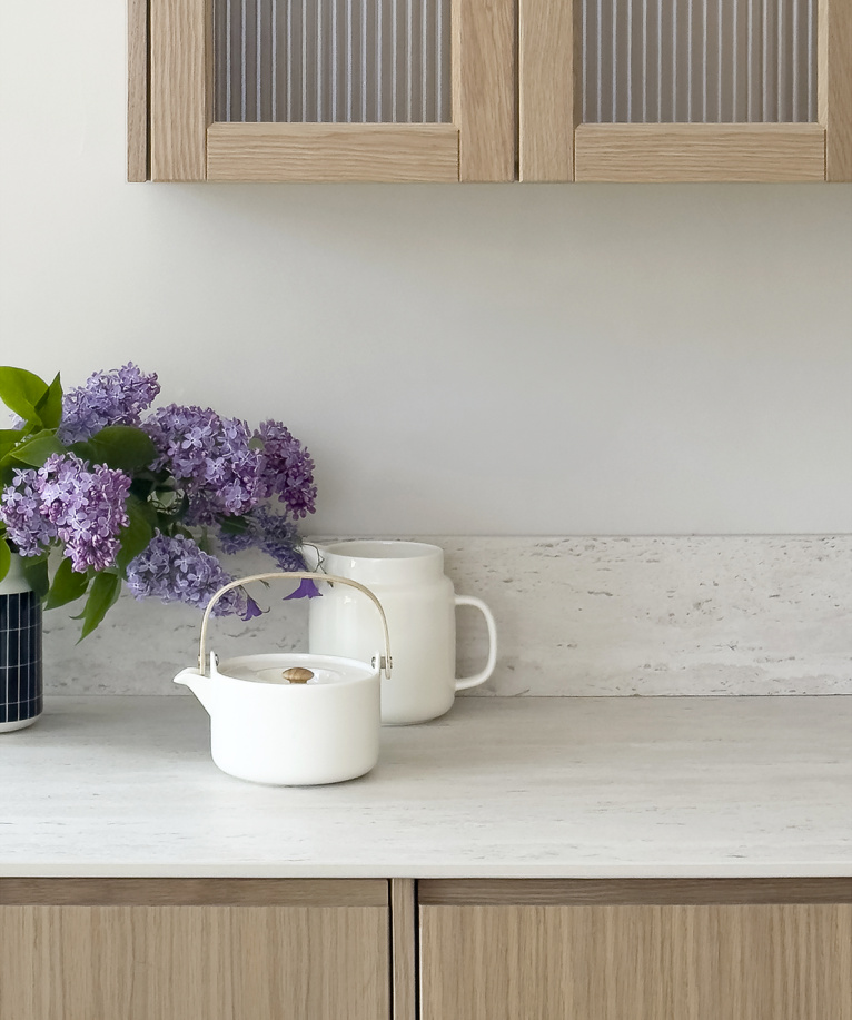 Perheen arjessa toimiva keittiö on kaiken kulmakivi! Lifestyle vaikuttaja Iida Åfeldt valitsi keittiöönsä raikkaita vaaleita sävyjä ja lämmintä puupintaa.