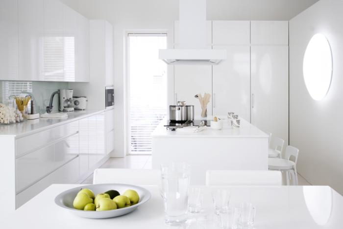 Ovimalli: Miranda, korkeakiilto MaitoVaakalistat: Mattamaalattu MaitoTasot: Valkoinen Corian 13 mm Välitilassa: Valkoinen lasi